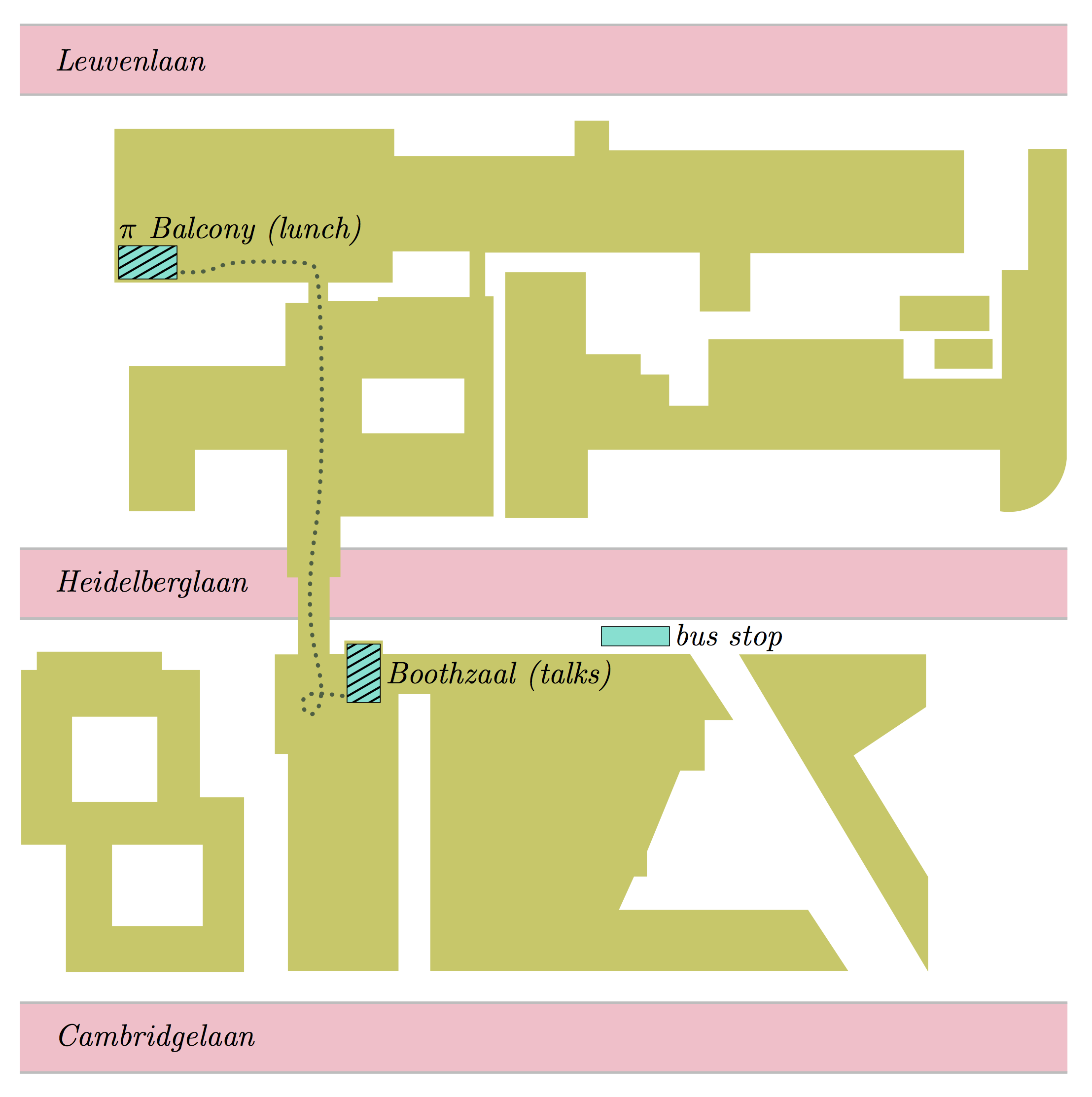 Lunch is served in room π of the Educatorium. From the conference room, go up the stairs, make a U-turn and cross over two walking bridges to the Educatorium. Immediately turn left, and go straight. Watch out for sloped ceilings. You are now at the restaurant: